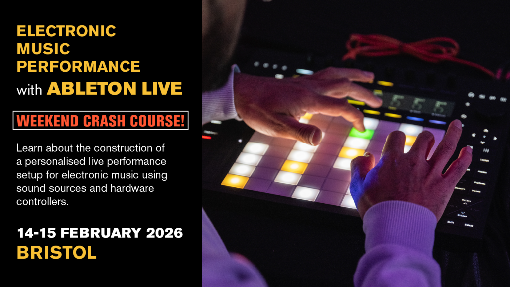 14-15 February 2026 I am delivering a weekend crash course ‘Electronic Music Performance with Ableton Live‘ in Bristol. This is being held in the training room at event production specialists PF Events and will provide everything you need to devise your own personal performance system and start building a liveset. Click here for more info or to grab one of the limited places.